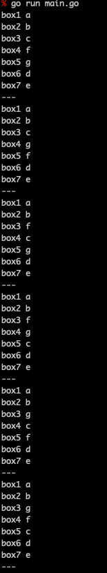 func kumiawase(boxes map[string][]int, used map[string]bool, result []string) []map[string]string {